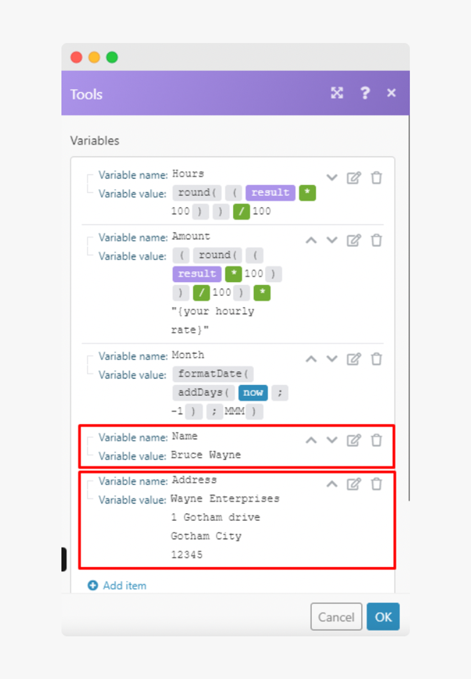 Connect Make to your time tracking app and set up the variables you want to appear on your invoices — like your pricing, due dates, name, and address.