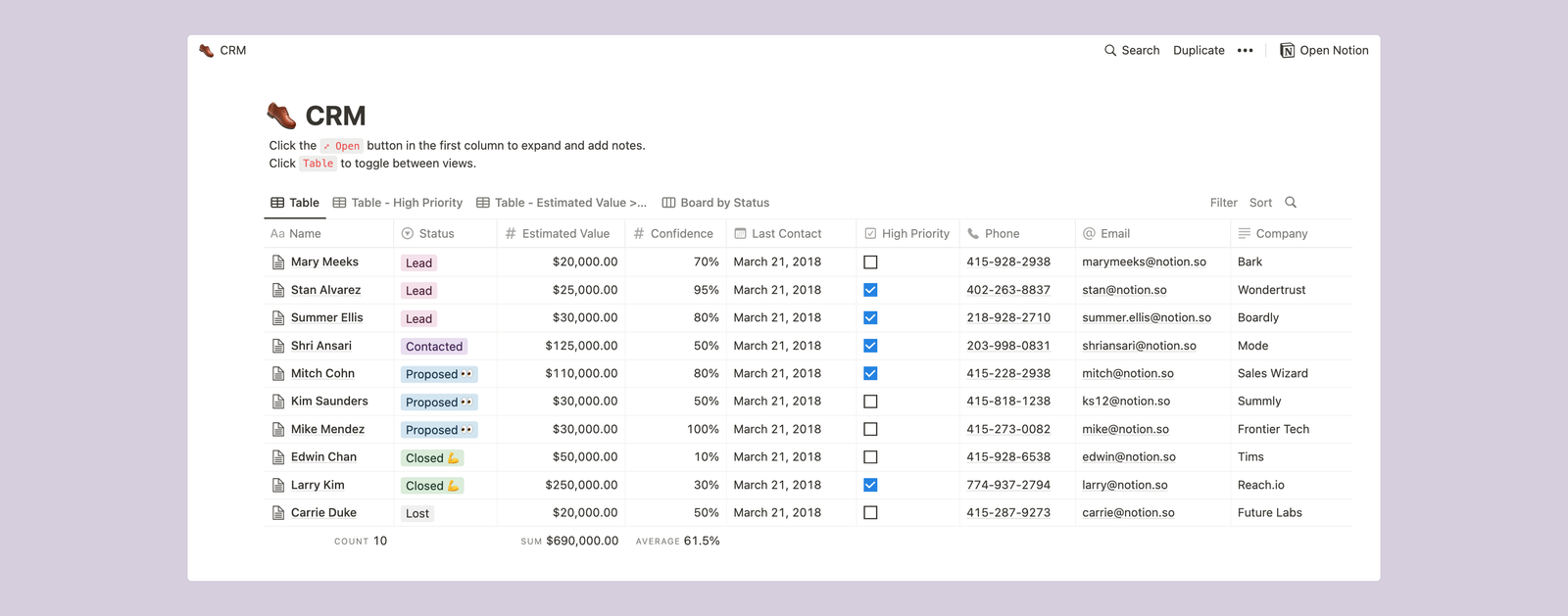 If you have a small team and don’t need to worry about who can do or edit what (permissions), Notion is a great place to start. If you don’t want everyone seeing everything, check out Airtable. Both tools are pretty straightforward to use.