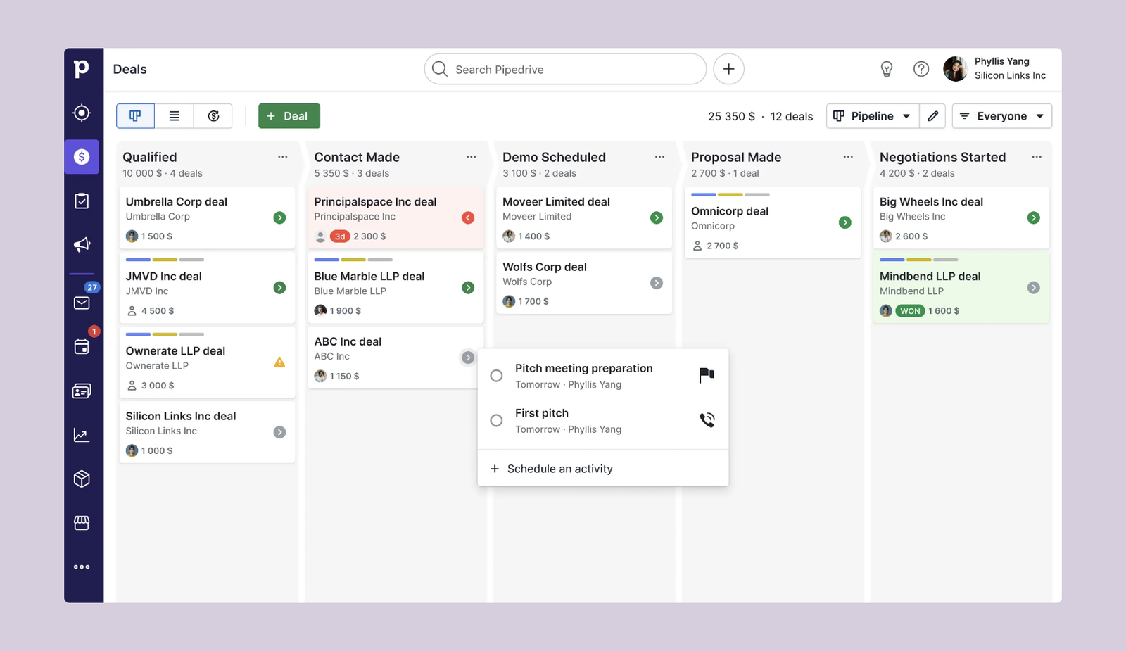 Pipedrive is a straightforward platform that allows you to build a totally custom sales pipeline. You can easily use their templates and import data from a spreadsheet or your CRM. It also has built-in automation features to streamline common tasks.